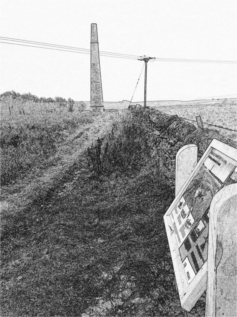 What I hadn’t known is that the Victorians mined for coal in the nearby Langley Coal Mine, to burn in the Langley Smelt Mill that melted the lead so it could be harvested from the ore. That makes convenient sense, doesn’t it? And so the lead ore was brought from mines up in Sparty Lea, Allenheads and Alston, along to the mills (Langley and Allen) by robust ponies, following the old drovers’ tracks of the Carriers Way across the moorland; later the ponies pulled wheeled carts along the new metallised toll roads. Now 130 years since the Langley Mill closed, the post-industrial landscape is still dominated by the giant chimneys.