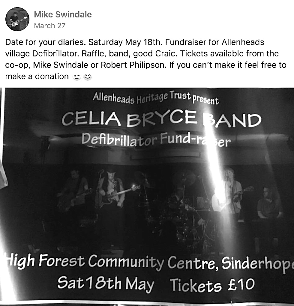 On Saturday evening, up at Sinderhope Community Centre, the Allenheads Heritage Trust presents the Celia Bryce Band to entertain in aid of the Allenheads Defibrillator Fund (they’re appearing everywhere — the defibrillators that is!). Sounds like a riotous evening up in Sinderhope, for sure.