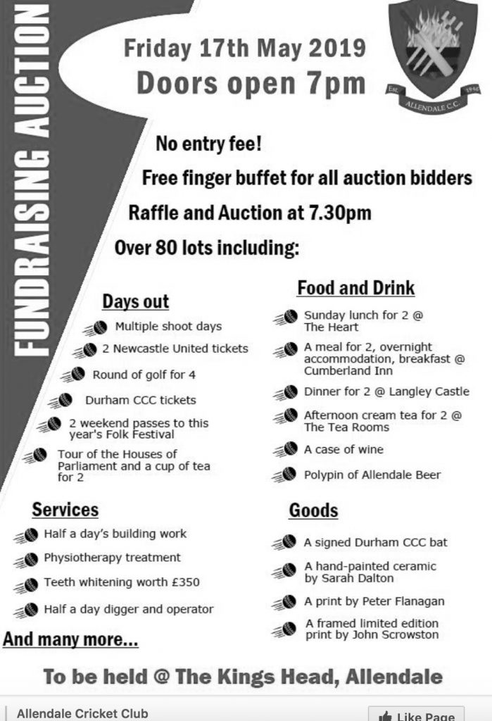 So on Friday the Allendale Cricket Club is holding its annual fund-raising auction, this year at The King’s Head, with what looks like an amazing set of entries. It’s no wonder the yearly total of funds raised tends to stagger the imagination, when all is said and done!